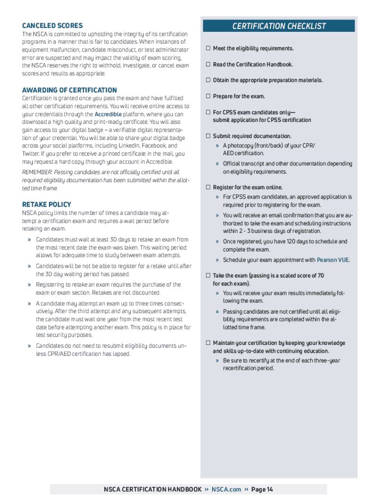 Individuals seeking NSCA certification or those renewing their certification must file the NSCA Certification Handbook.