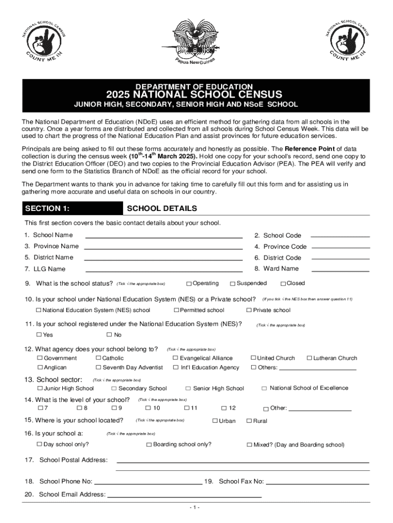 This document is a census form used by the National Department of Education to gather data from schools across the country for educational planning and resource allocation. It includes sections for