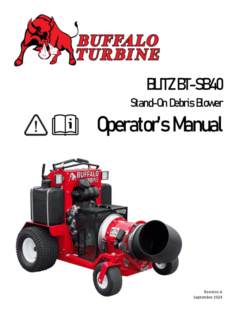 This manual provides operational, safety, maintenance, and troubleshooting guidelines for the BLITZ BT-SB40 Stand-On Debris Blower, ensuring safe and efficient use of the equipment in the turf care