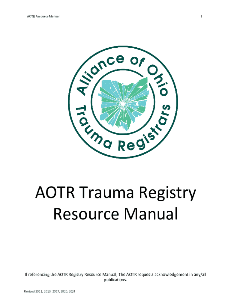 This manual provides guidelines and resources for trauma registrars to assist in the collection, analysis, and reporting of trauma data, ensuring the integrity and quality of the information as it