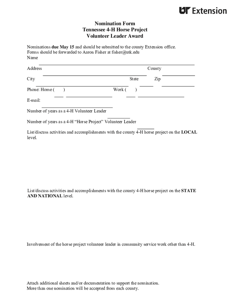 This form is used to submit nominations for the Volunteer Leader Award associated with the Tennessee 4-H Horse Project, encouraging recognition of volunteer contributions at local, state, and national
