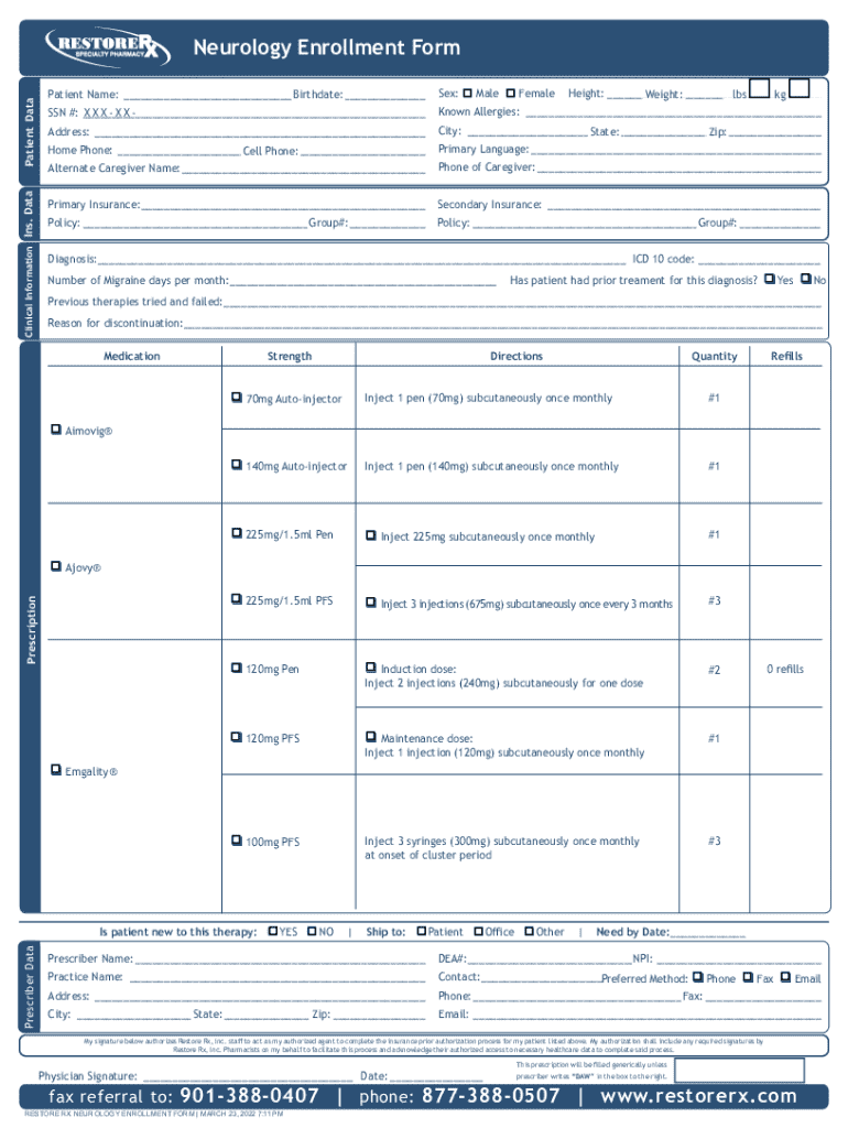 This form is used for gathering essential patient information for neurology treatment enrollment, including personal data, medical history, and medication prescriptions.