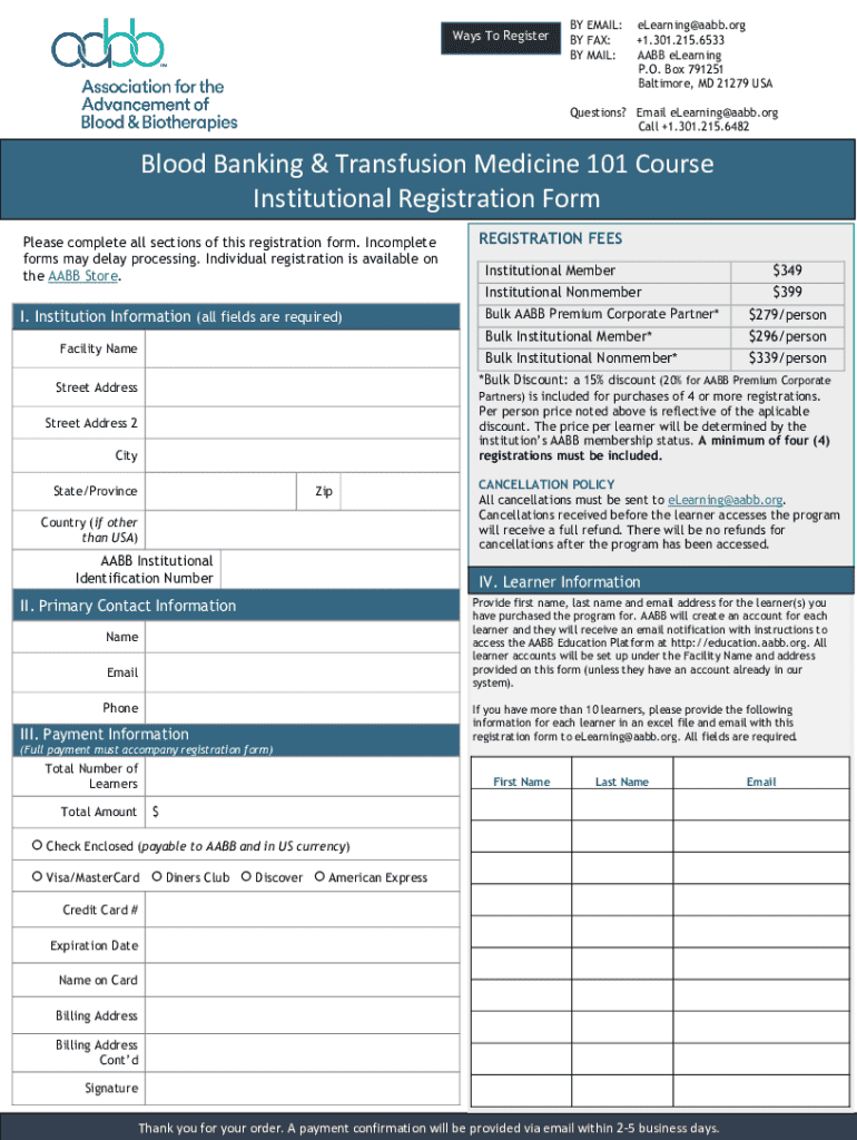 Get the free Blood Banking & Transfusion Medicine 101 Course Institutional Registration Form