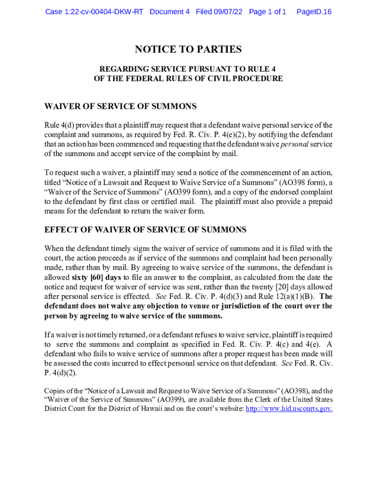 Get the free Notice of a Lawsuit and Request to Waive Service of a Summons