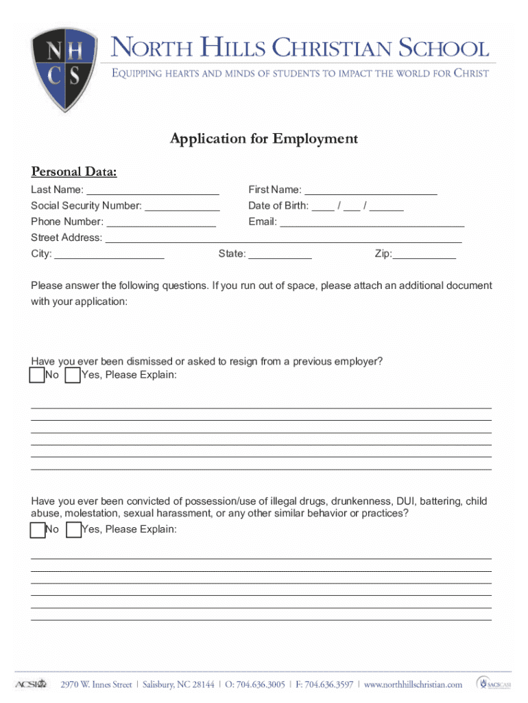 This document serves as an application for potential employment at North Hills Christian School, requiring personal data, employment history, education, references, and a statement of faith aligned