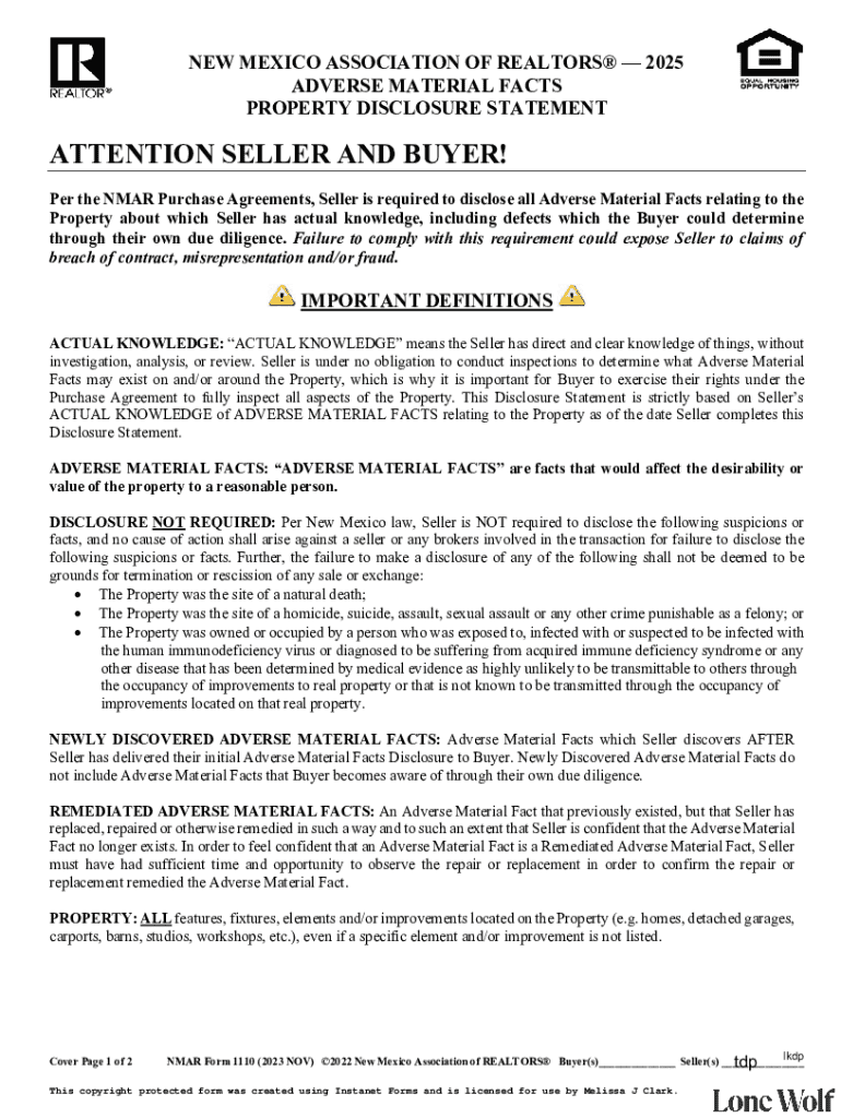 Get the free New Mexico Association of Realtors® — 2025 Adverse Material Facts Property Disclosur...