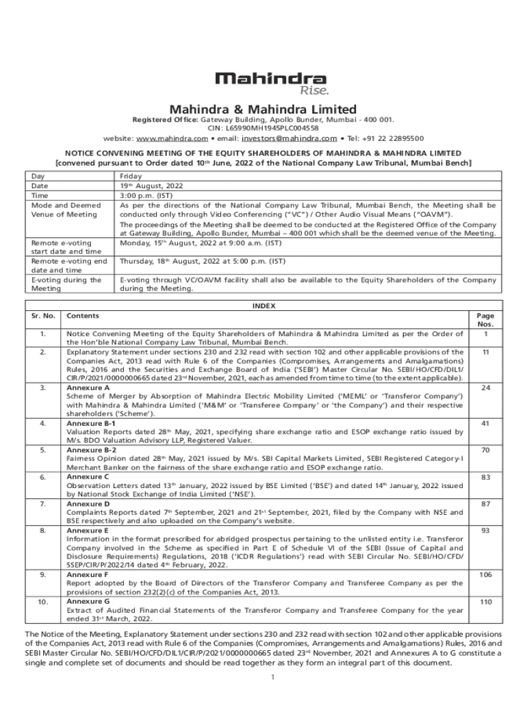 This notice convenes a meeting of the equity shareholders of Mahindra & Mahindra Limited to consider the merger of Mahindra Electric Mobility Limited with Mahindra & Mahindra Limited and includes