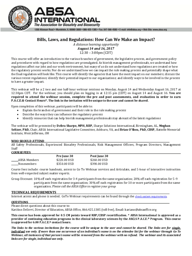 This document provides details about a distance learning webinar aimed at educating biosafety professionals on government regulations, the legislative process, and how to influence rule-making.