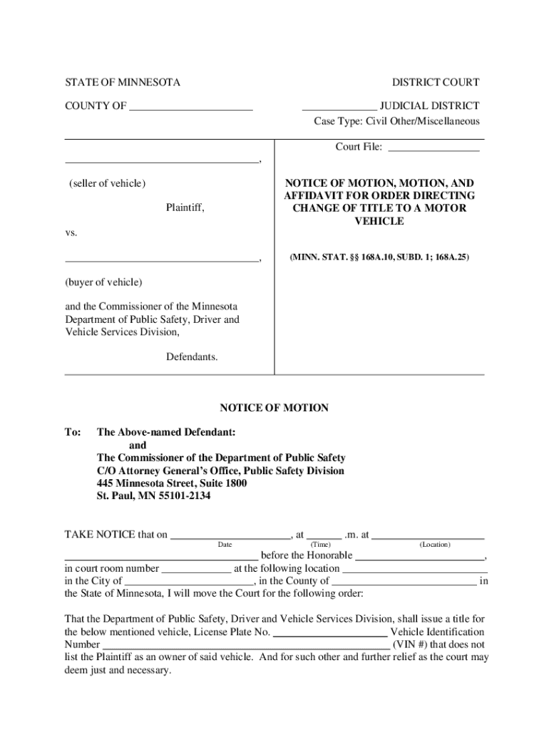 Get the free Notice of Motion, Motion, and Affidavit for Order Directing Change of Title to a Mot...