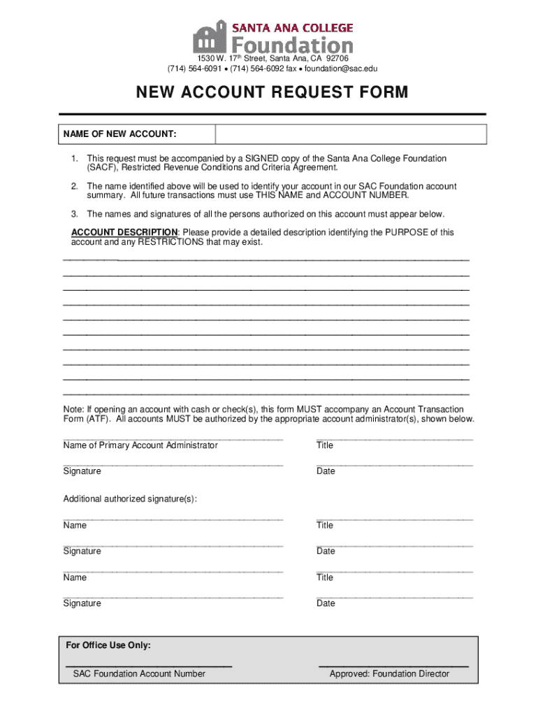 This form is used to request the creation of a new account with the Santa Ana College Foundation, requiring authorization and a detailed account description.