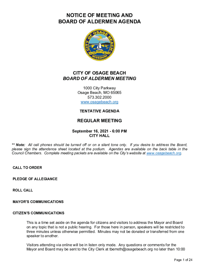 Get the free Notice of Meeting and Board of Aldermen Agenda