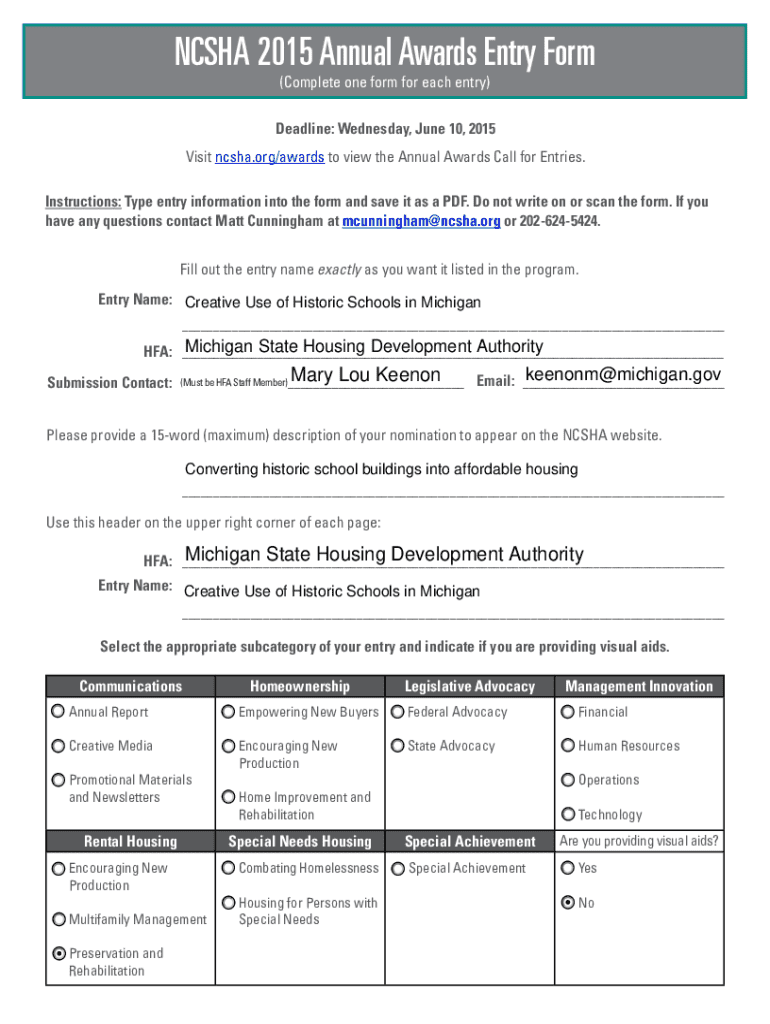 The NCSHA 2015 Annual Awards Form is a crucial document in applying for these prestigious awards. This form serves as the official application that documents all necessary information required for consideration. Each submission encapsulates a narrative of the project, its outcomes, and the impact it has made, contributing to the overall assessment.
