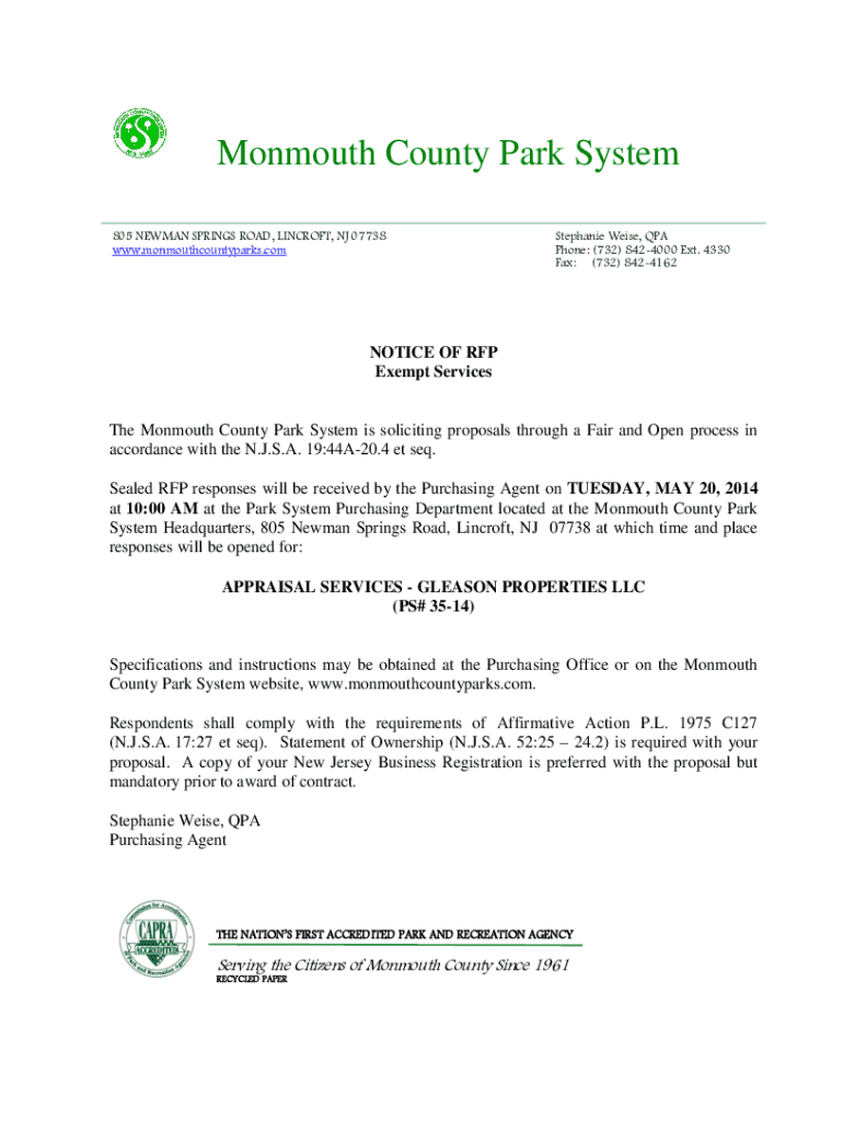 This document is a request for proposals issued by the Monmouth County Park System for professional appraisal services for specific properties, detailing administrative requirements and compliance