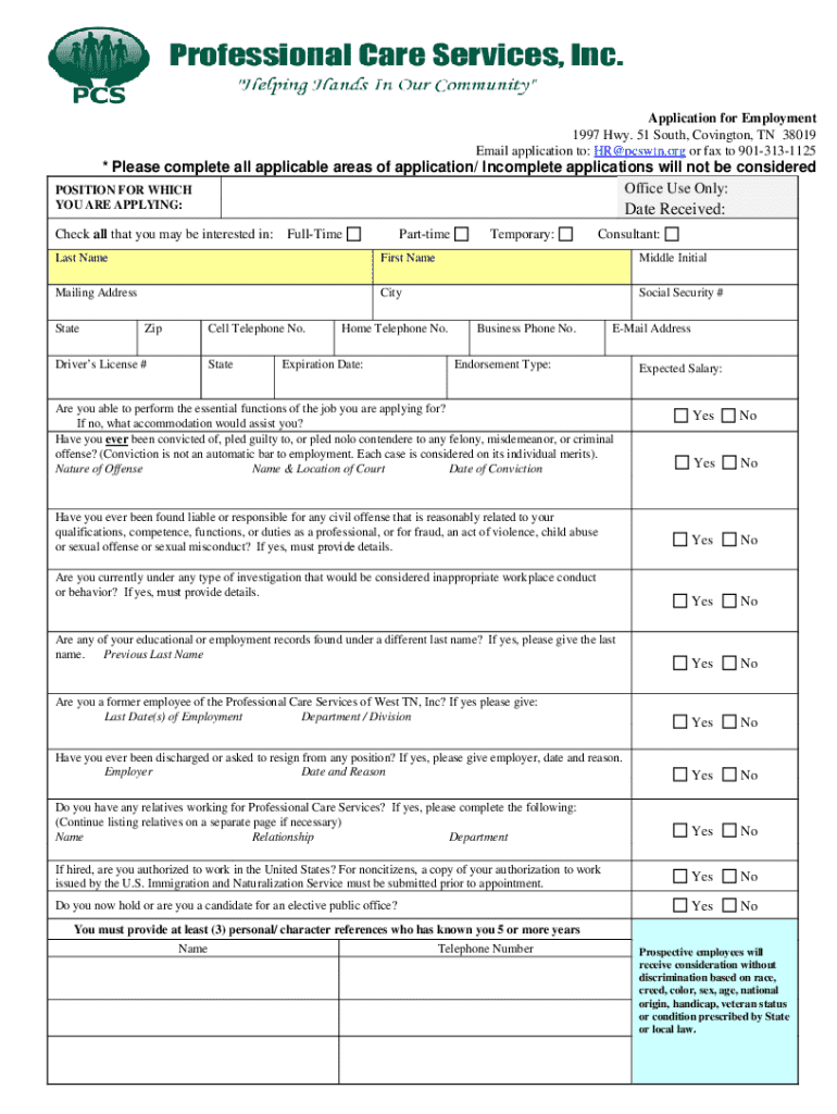 This document serves as an application form for prospective employees to apply for positions at Professional Care Services of West TN, Inc. It collects personal, educational, and employment history
