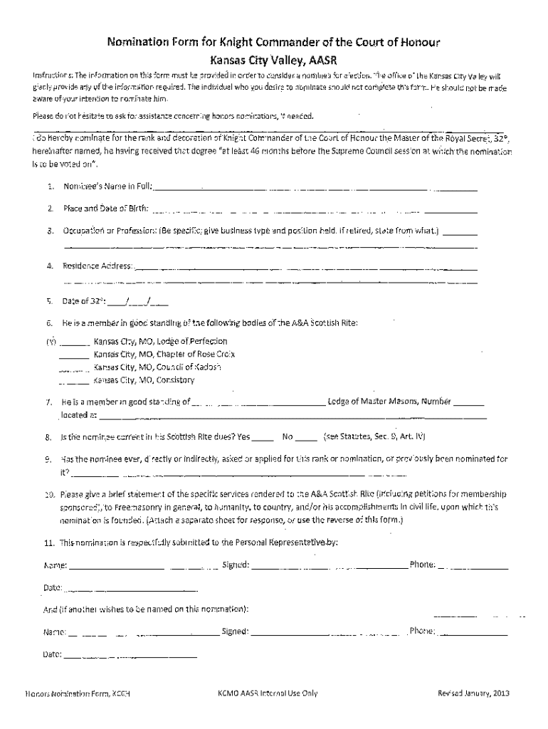 Get the free Nomination Form for Knight Commander of the Court of Honour