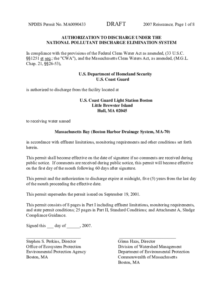 This document authorizes the U.S. Coast Guard to discharge treated sanitary wastewater from its facility into Massachusetts Bay, outlining specific effluent limitations, monitoring requirements, and