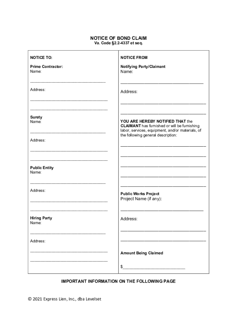 The notice of bond claim form is a crucial document for parties involved in construction and contracting activities. It serves as a formal notification of a claim regarding a bond, which is a financial assurance that the party will fulfill their contractual obligations. This document helps protect subcontractors, suppliers, and other stakeholders against non-payment, thereby playing a vital role in ensuring the financial stability of projects.
