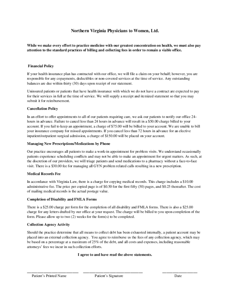 This document outlines the financial policies related to billing, payments, cancellations, and other financial responsibilities for patients of the Northern Virginia Physicians to Women, Ltd.