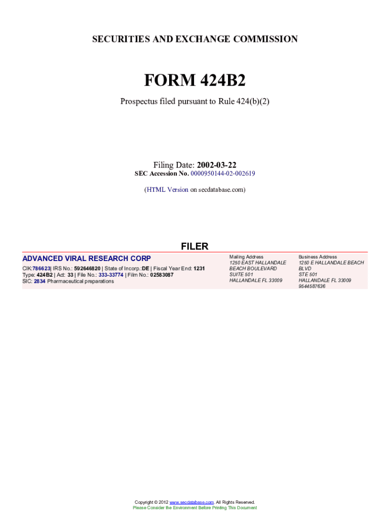 A prospectus supplement filed by Advanced Viral Research Corp providing details about a securities offering, including the type of shares being offered and the use of proceeds.