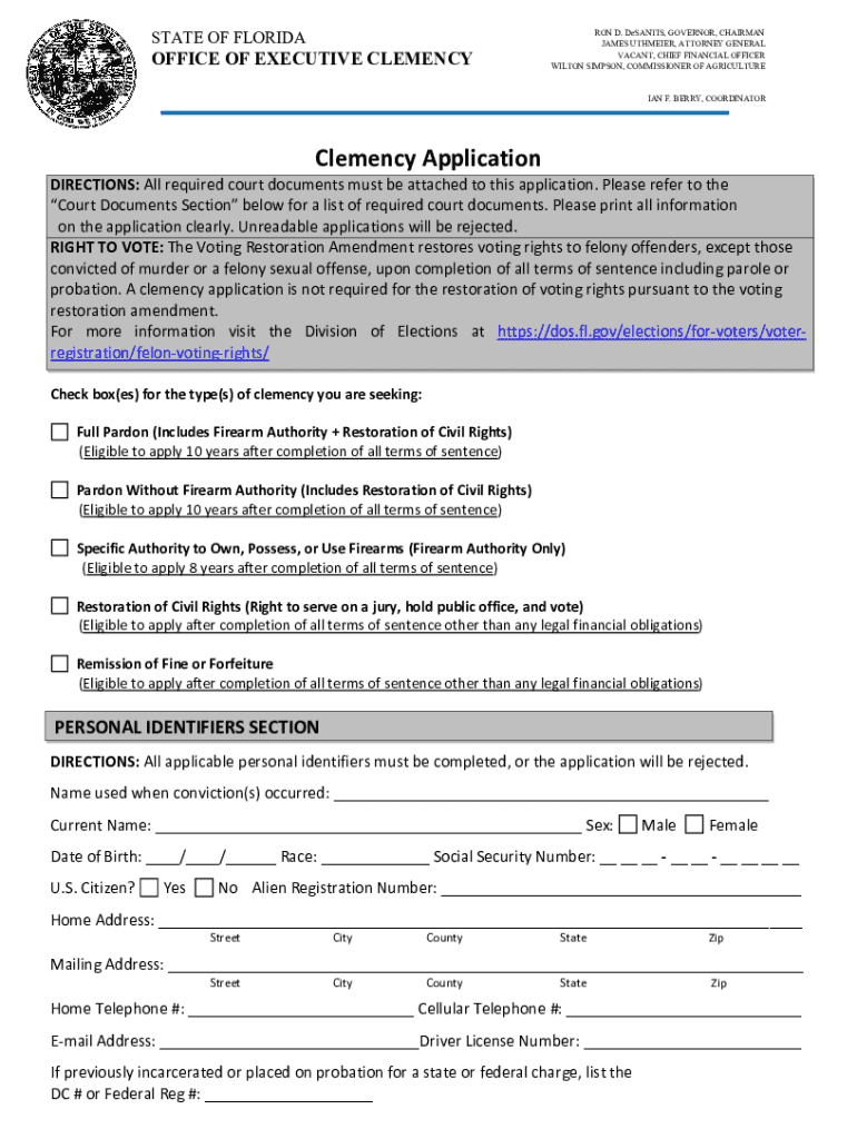 This document is a clemency application form used in Florida for individuals seeking restoration of their voting rights upon completion of their sentence, including those convicted of felonies. The