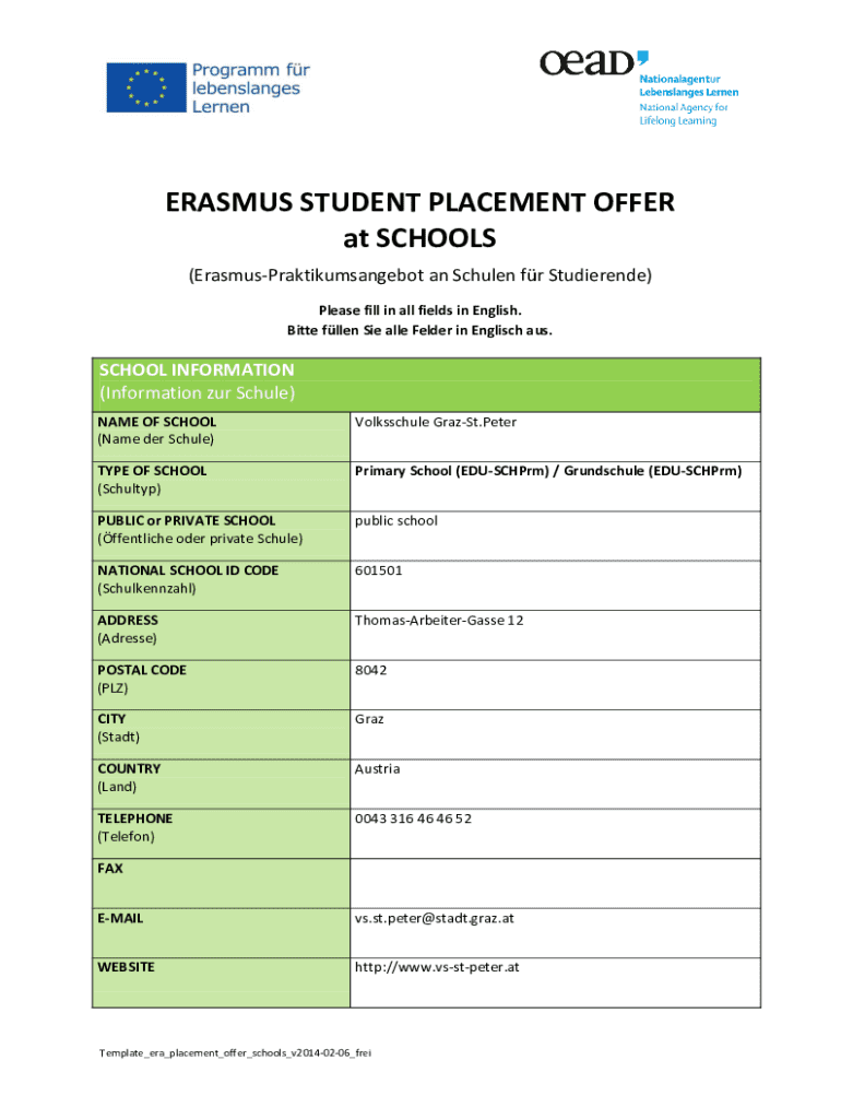 Get the free Erasmus Student Placement Offer at Schools - www2 cmepius
