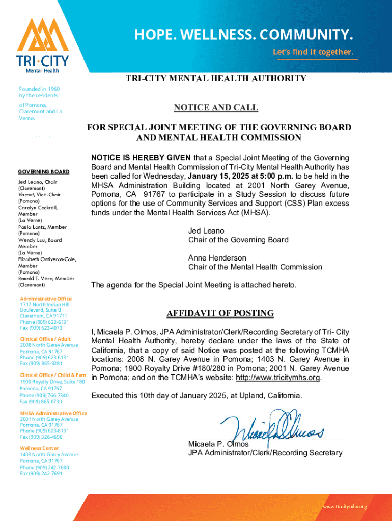 This document serves as a formal notice for a special joint meeting of the Tri-City Mental Health Authority\'s Governing Board and Mental Health Commission to discuss and address various issues related