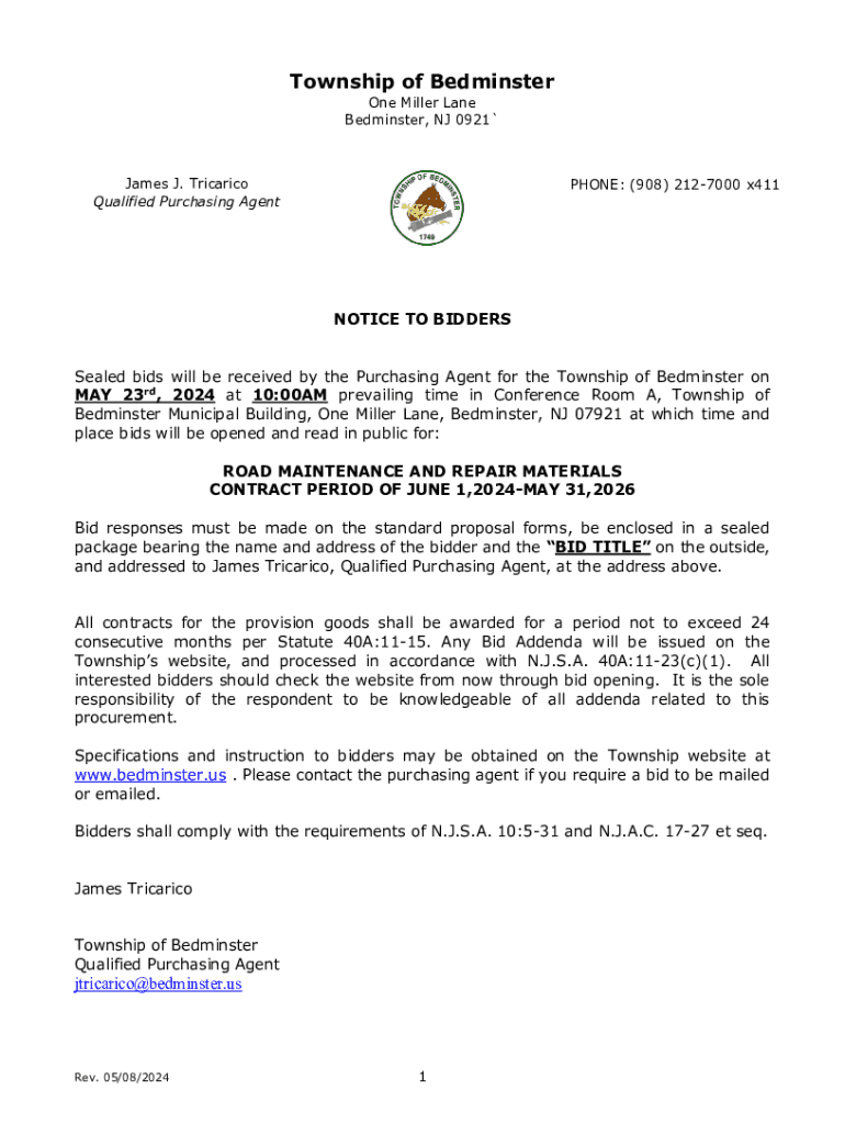 This document serves as a notice to bidders for submitting proposals for road maintenance and repair materials for the Township of Bedminster, detailing the submission instructions, bid security requirements,