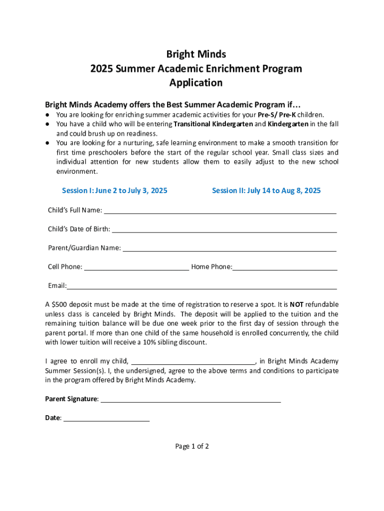 Get the free Bright Minds 2025 Summer Academic Enrichment Program Application