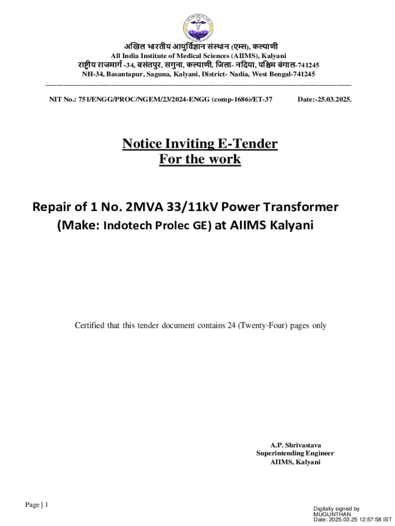 Get the free Notice Inviting E-tender for Repair of Power Transformer at Aiims Kalyani