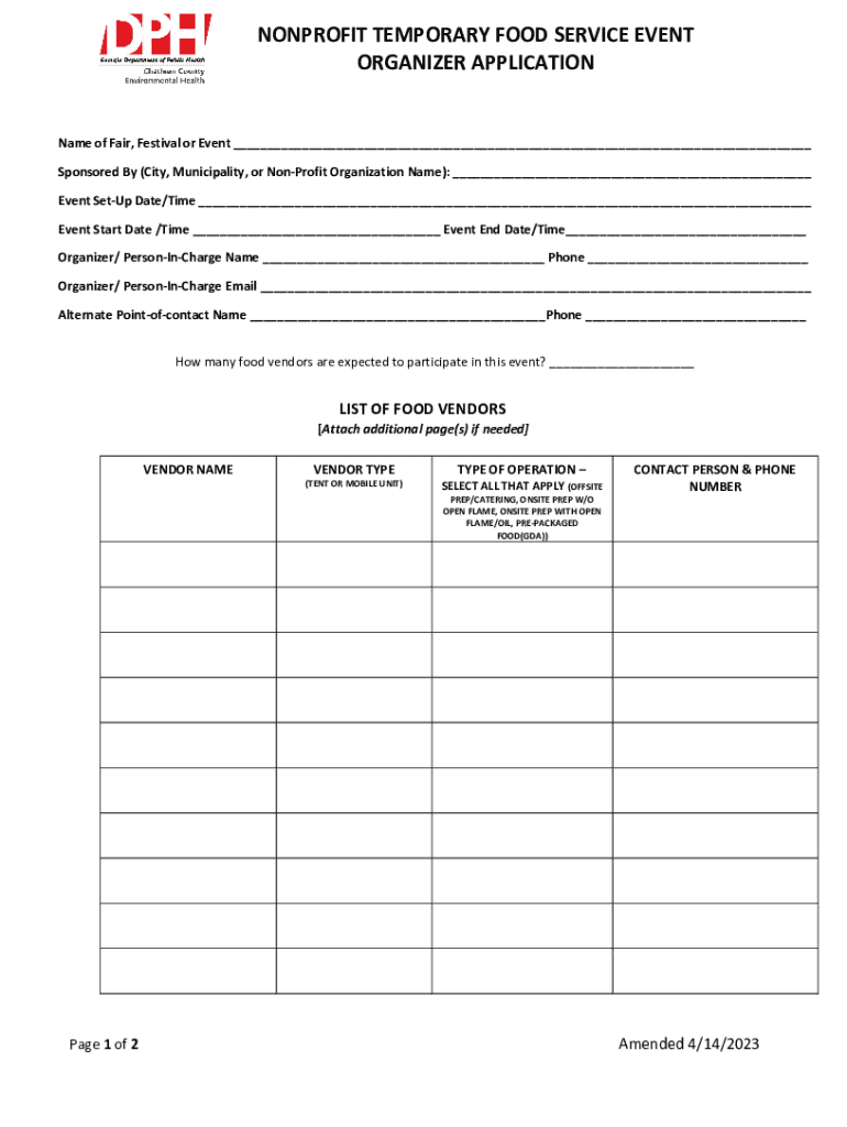 The nonprofit temporary food service form is a crucial document that organizations must file to obtain permission to serve food temporarily. This form ensures that all food service operations comply with local health standards and regulations.