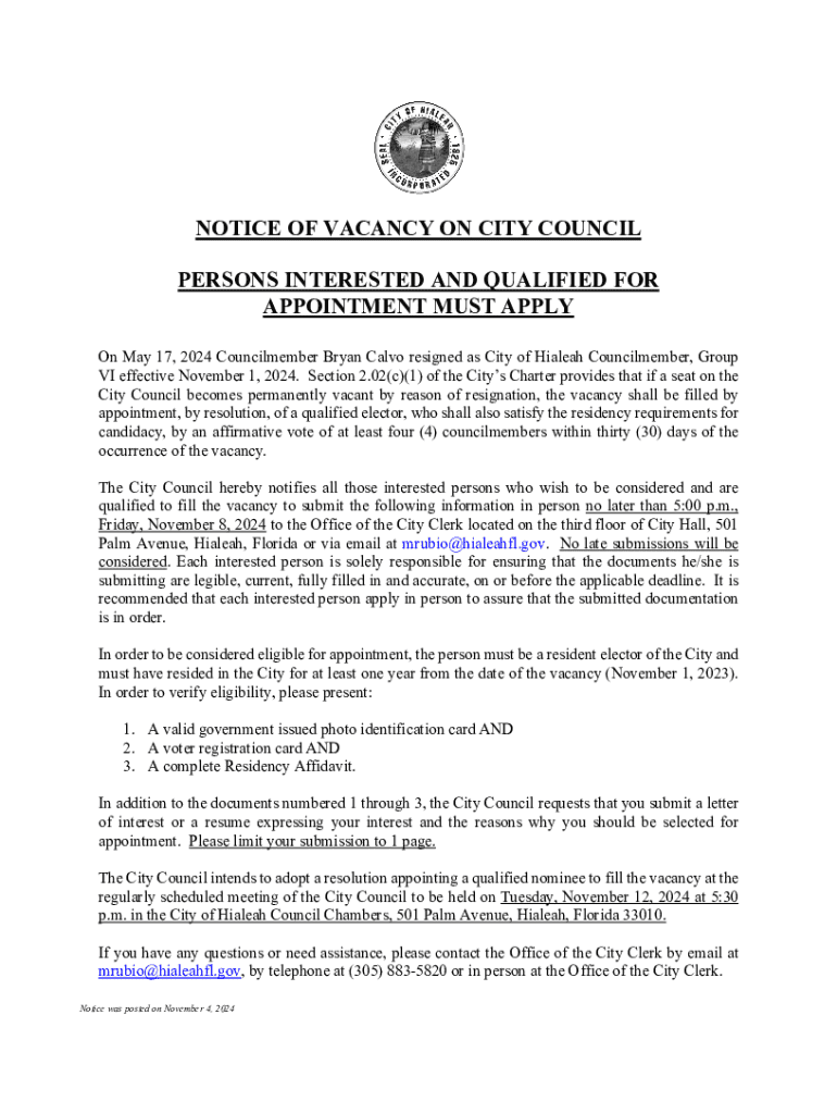 Get the free Notice of Vacancy on City Council