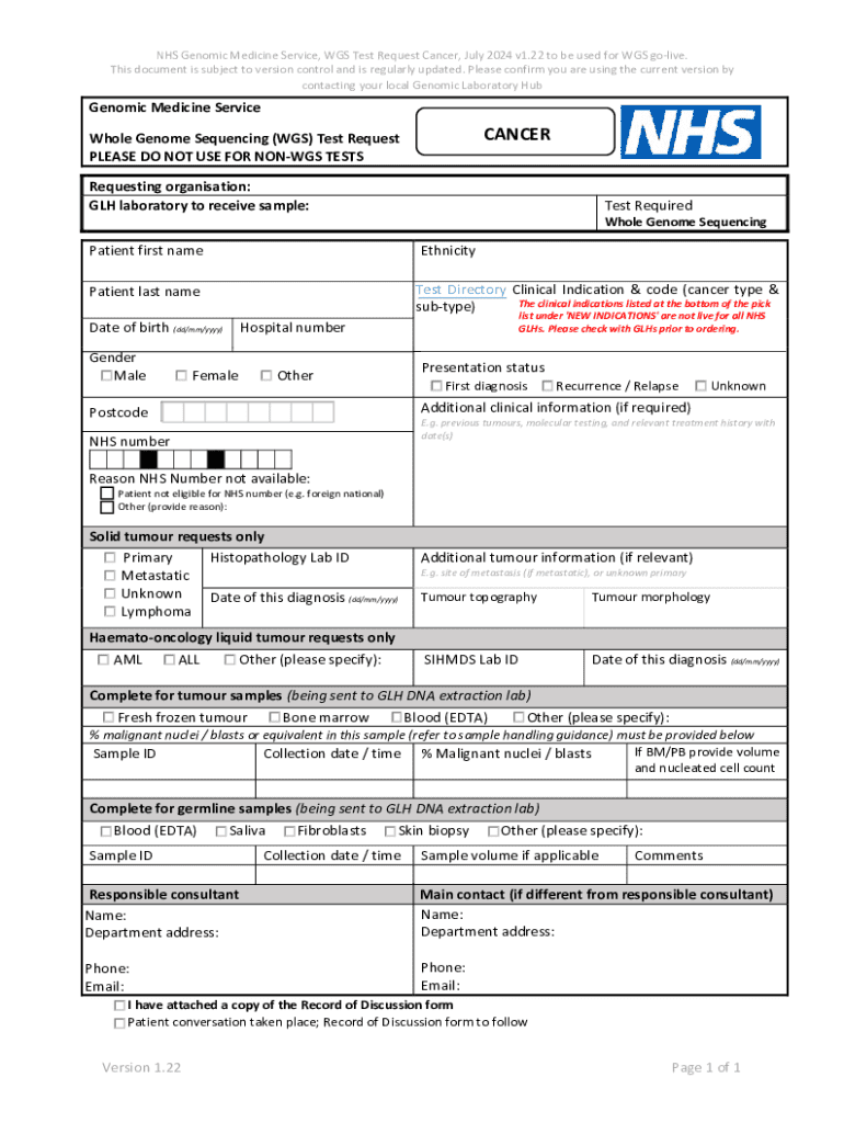 The NHS Genomic Medicine Service Form is a key document in the landscape of genomic medicine within the UK's National Health Service. This form is crucial for facilitating genomic testing and ensuring that patients receive personalized healthcare based on their genetic make-up. As genomic medicine is increasingly integrated into standard health care practices, the NHS plays a pivotal role in promoting genetic understanding and treatment, making this form essential for both practitioners and patients.