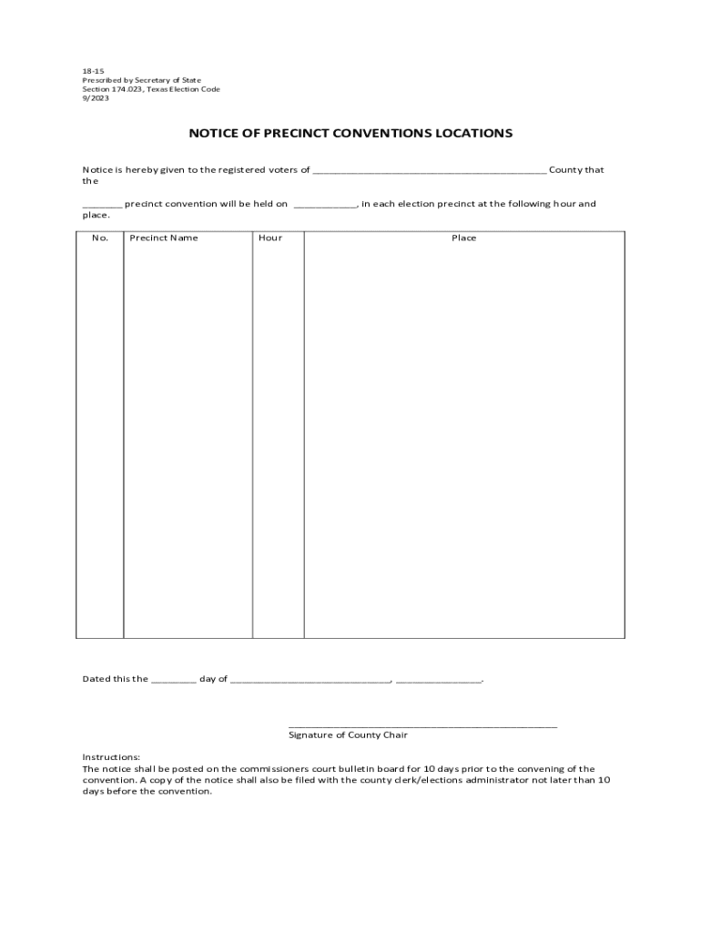 A notice of precinct conventions is a formal announcement that provides details about an upcoming precinct convention, including the date, time, location, and purpose of the event.