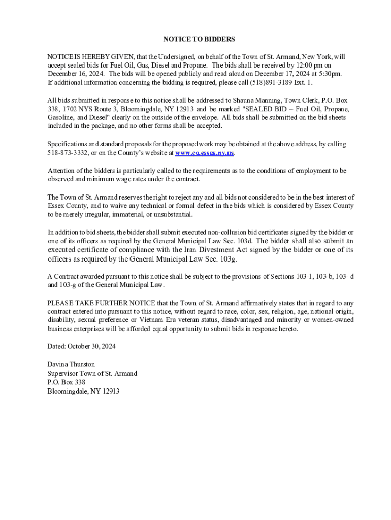 Get the free Notice to Bidders for Fuel Oil, Propane, Diesel, and Gasoline