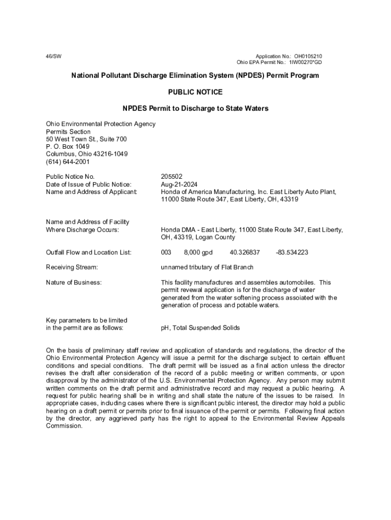 This document serves as a public notice for the issuance of a National Pollutant Discharge Elimination System (NPDES) permit, providing details about the discharge of pollutants from Honda of America