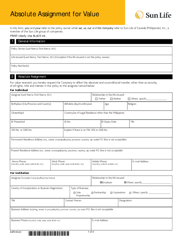 To fill out an absolute assignment for value, one must complete the designated form, providing details such as the original policyowner's information, the assignee's information, the policy number, and a declaration that the assignment is absolute.