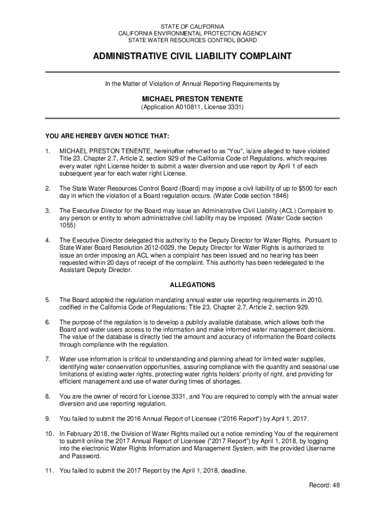 This document serves as an official complaint against Michael Preston Tenente for failing to submit required annual water diversion and use reports, detailing the allegations, proposed penalties,