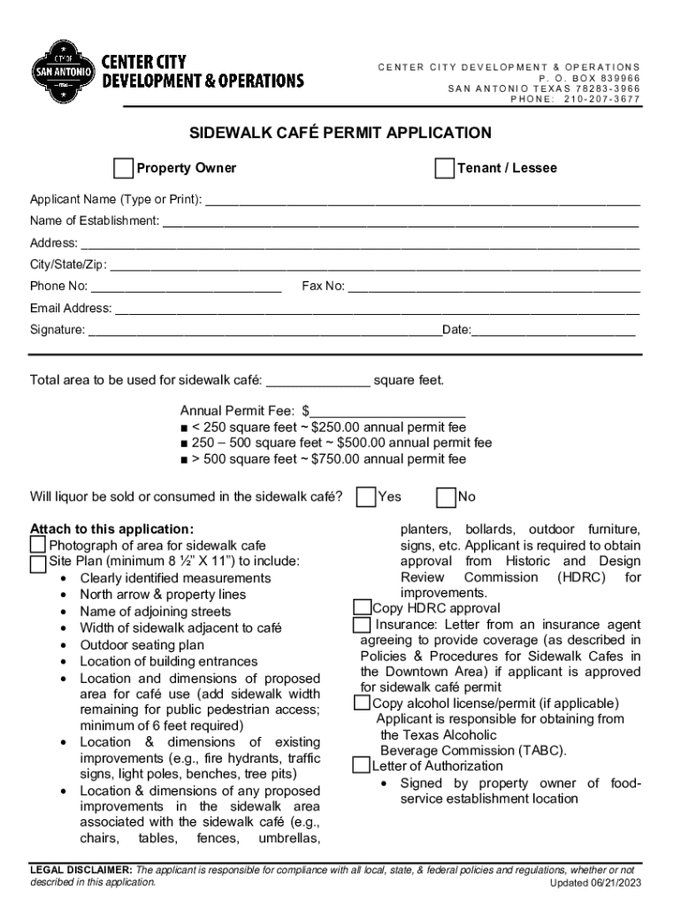 The next critical step is filling out the sidewalk café permit application form accurately. It consists of multiple sections, each requiring detailed information. Key components include your business information, proposed café layout, and compliance statements detailing how your plan adheres to regulations.
