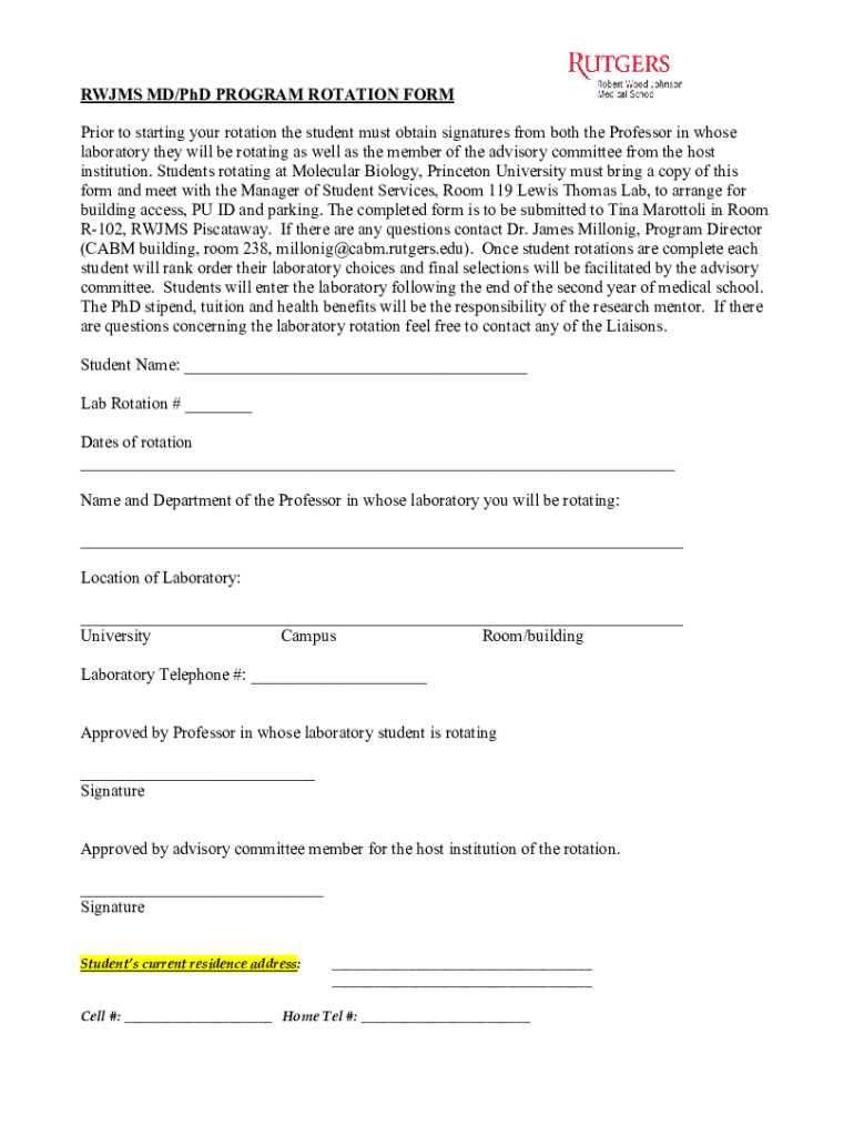 This form is used by students participating in the RWJMS MD/PhD program to obtain necessary approvals for laboratory rotations, including details such as student information, laboratory details, and
