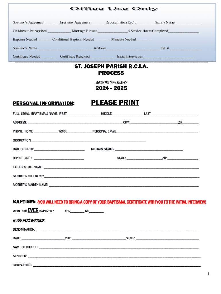 To fill out the St. Joseph Parish RCIA, individuals must complete an application form provided by the parish, which typically includes personal information, baptismal status, and an explanation of their interest in becoming Catholic.