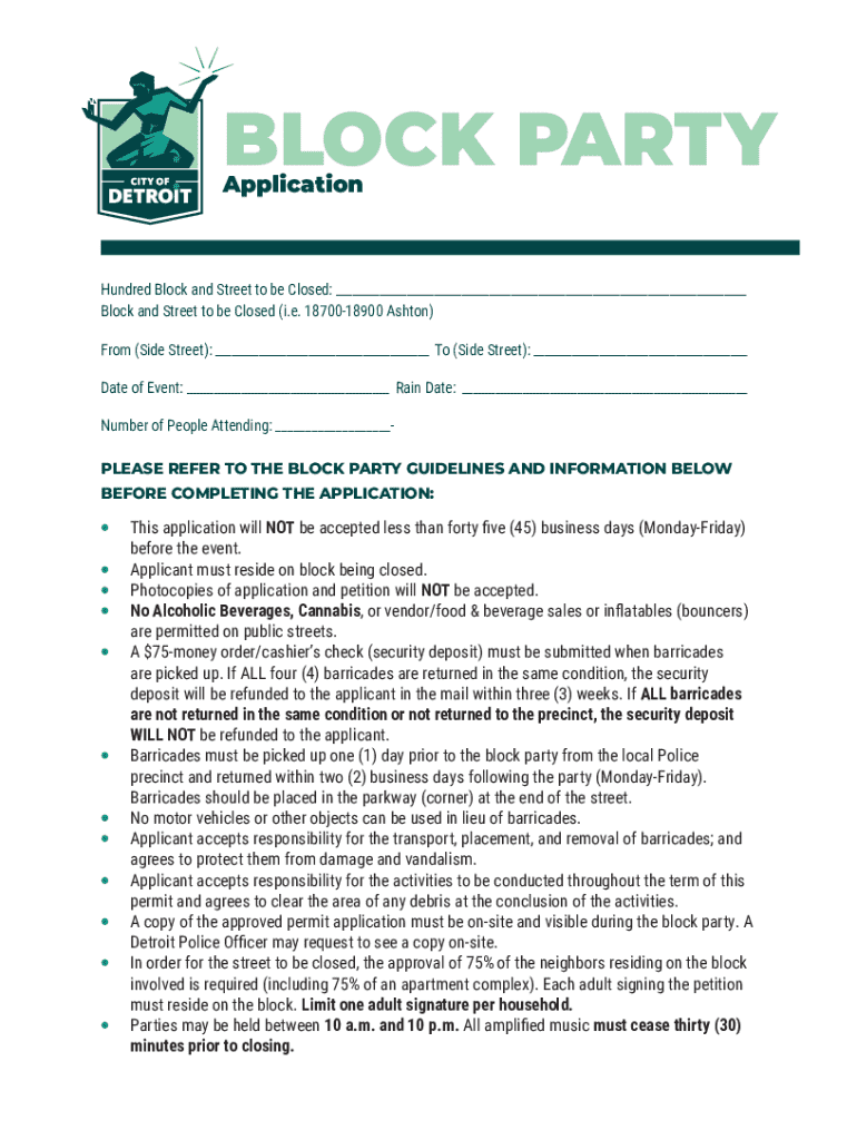 The block party application form is essential for officially planning your event. This form is your ticket to securing necessary permits and ensuring compliance with local regulations. You can typically find the application form on your local government’s website or through community liaison offices.