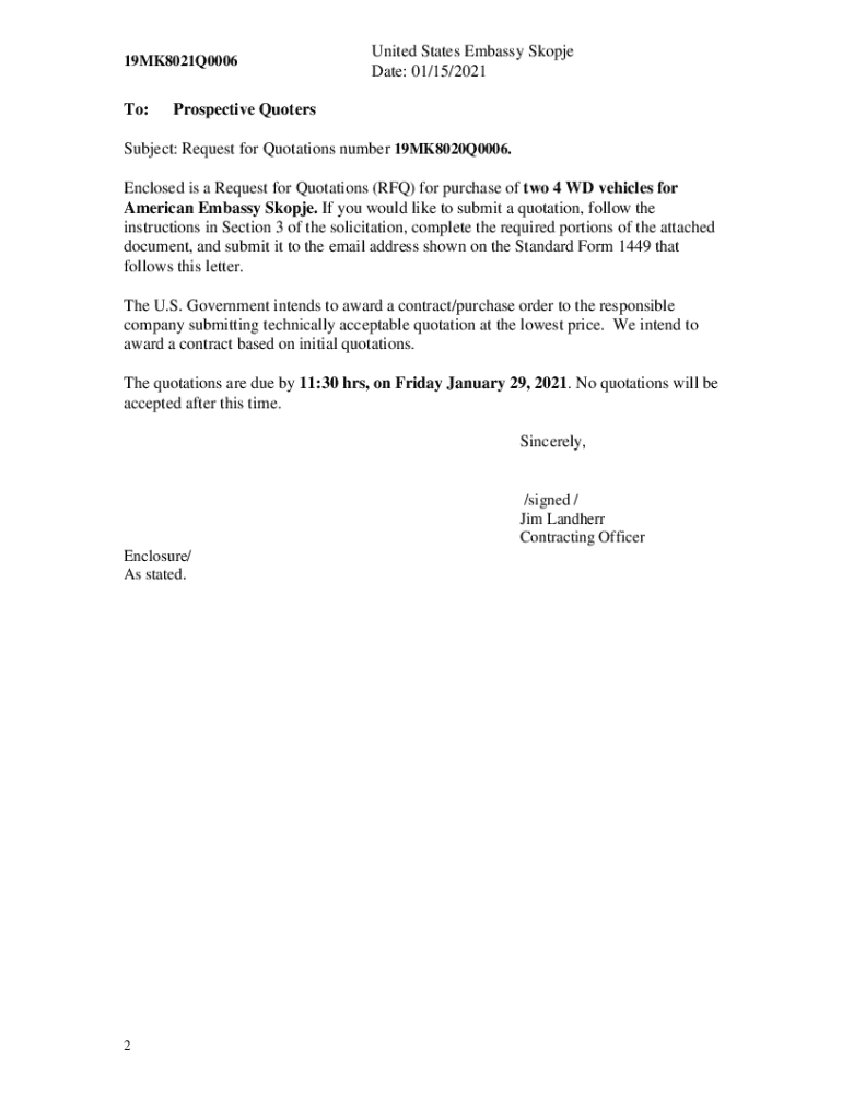 This document is a Request for Quotations (RFQ) for the purchase of two 4 WD vehicles for the American Embassy in Skopje, outlining specifications, submission instructions, and compliance requirements.