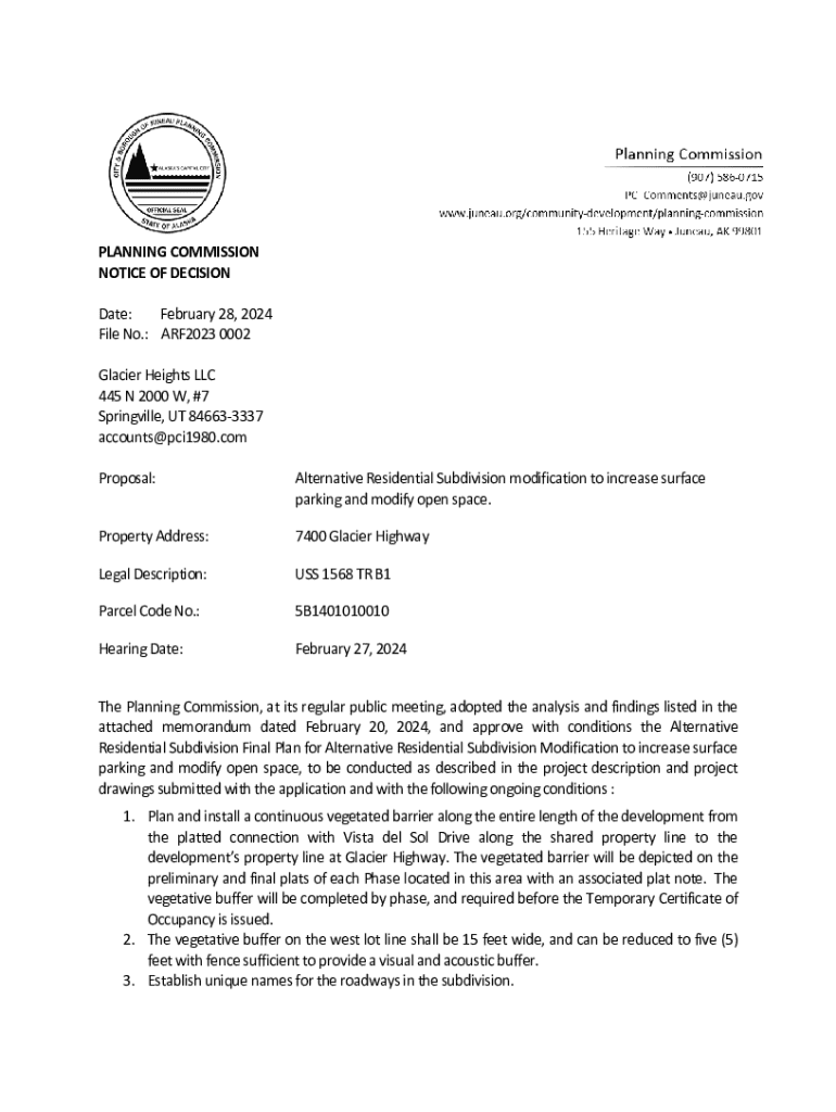 This document serves as an official notice from the Planning Commission regarding the approval of modifications to a residential subdivision, including conditions for development, effective dates,