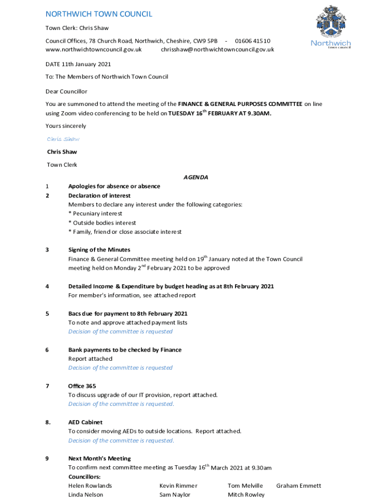 Get the free Northwich Town Council Meeting Agenda and Minutes