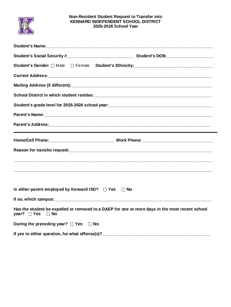 Non-resident Student Request to Transfer Into Kennard Independent School District 2025-2026 School Year word template: frequently asked questions