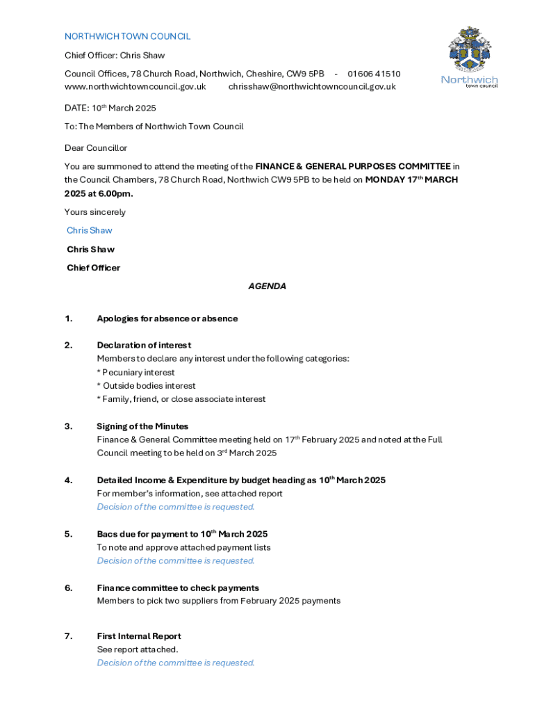 This document serves as the official agenda for the Northwich Town Council Finance & General Purposes Committee meeting, detailing attendance, declarations of interest, financial approvals, and reports.