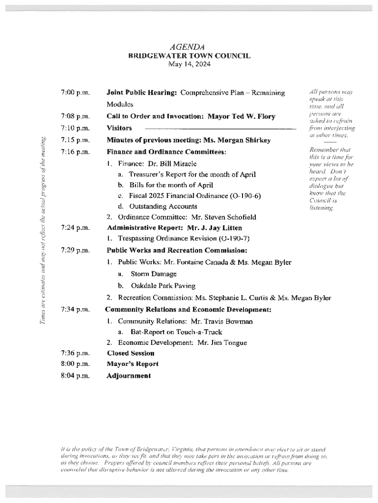 Get the free Bridgewater Town Council Meeting Agenda and Minutes