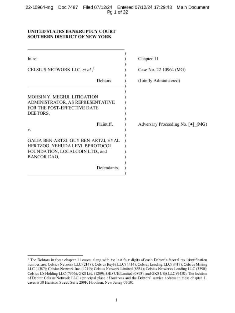 This document is an adversary complaint filed in the United States Bankruptcy Court for the Southern District of New York related to the bankruptcy case of Celsius Network LLC, alleging breach of