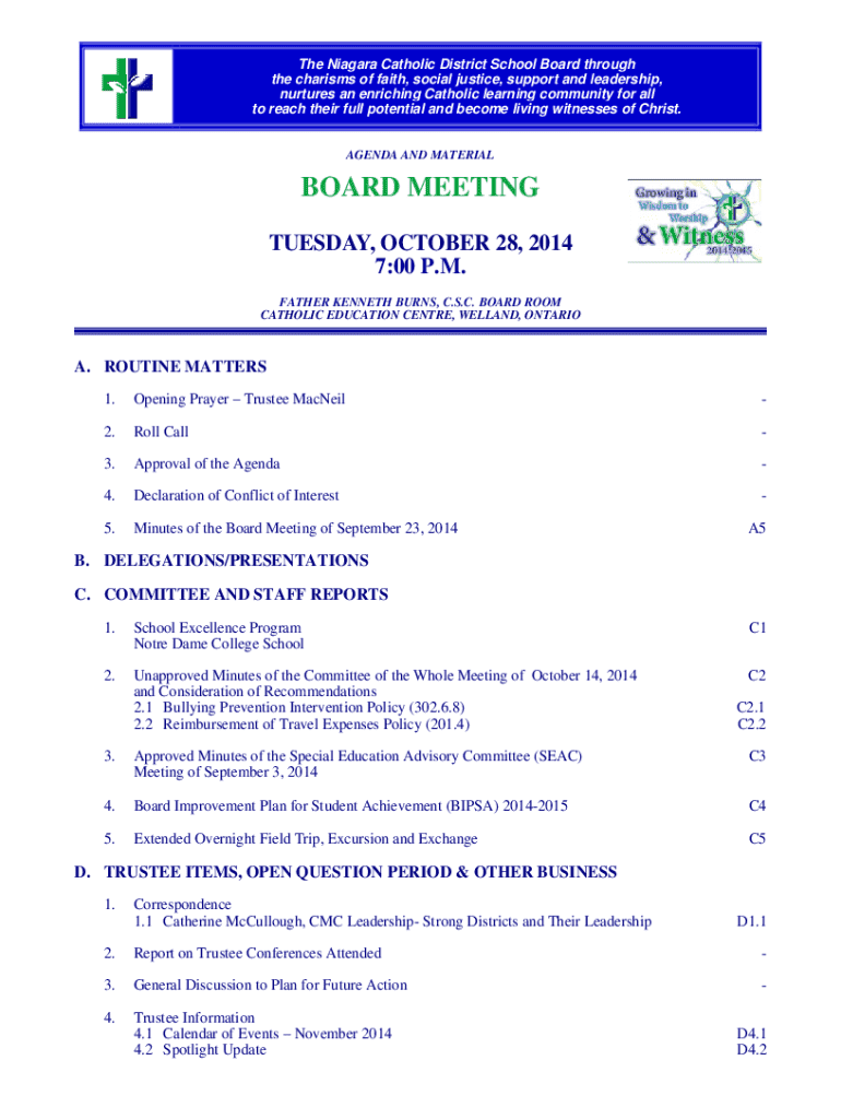 Get the free Niagara Catholic District School Board Board Meeting Agenda