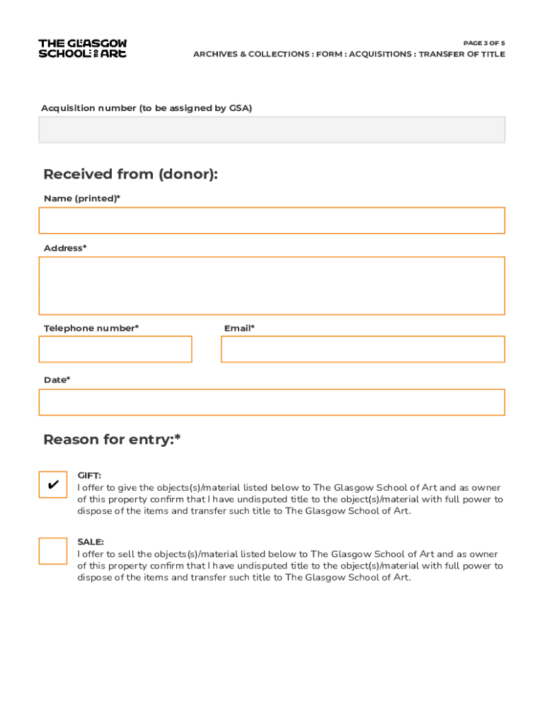This document is used for the transfer of title and copyright of artwork and archival materials to The Glasgow School of Art, including details for donors and conditions related to the acquisition.